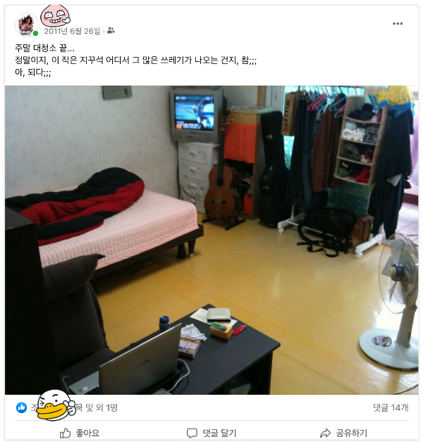 마침내 나도 에어컨이 달린 원룸에서 살게 되었다. 그리고 12년 전, 오랜만에 청소한 기념으로 맨 위의 사진을 페이스북에 남긴 거다.