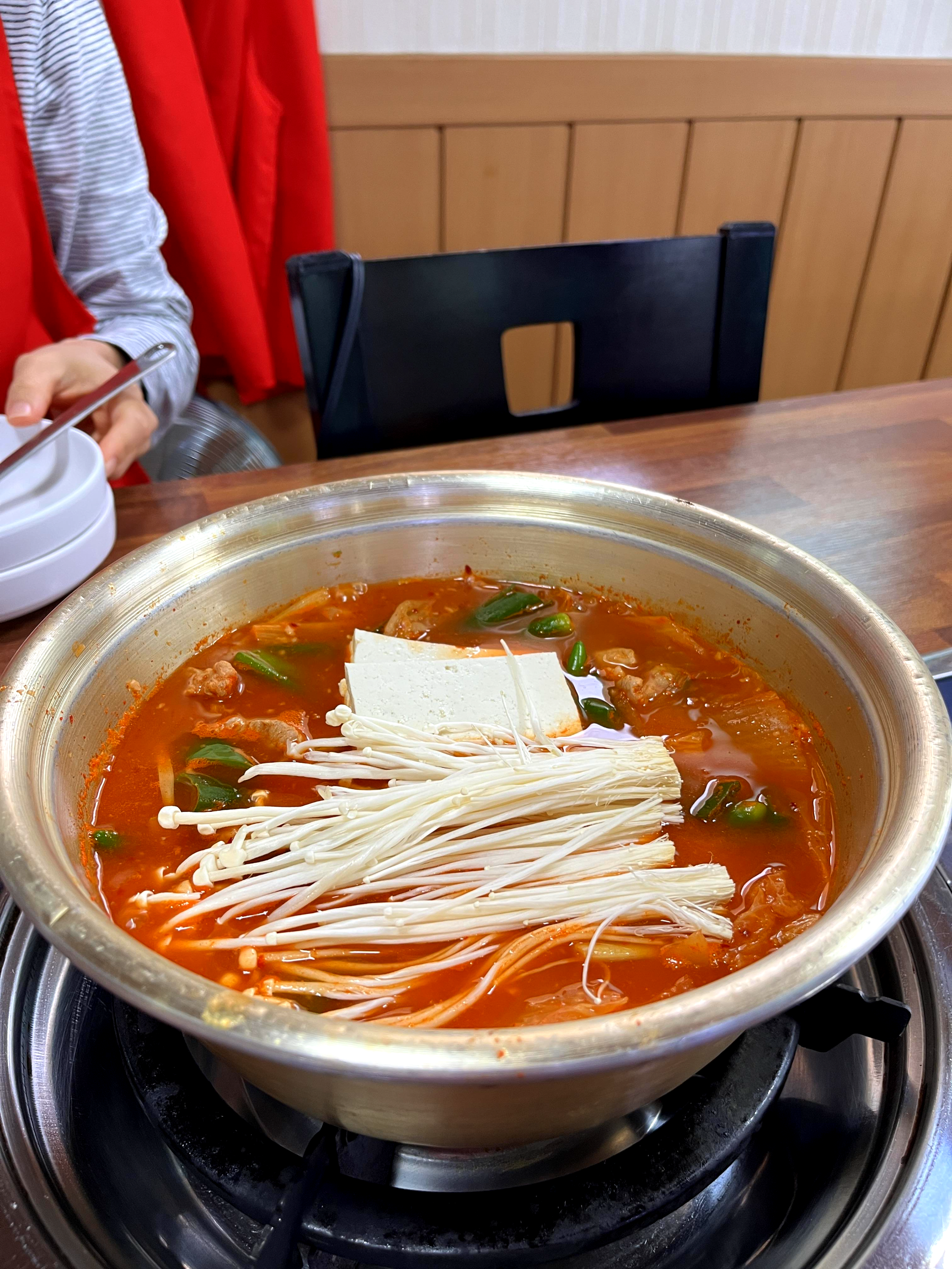 그렇게 감탄사를 내지르며 집어먹다 보면 메인 메뉴인 김치찌개가 나온다.