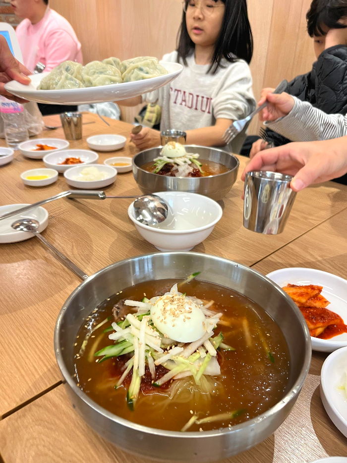 부산 여행 중 밀면은 꼭 한번 먹어보고 싶었는데, 마치 기다리고 있었다는 듯 길목에서 손짓하고 있었다. 어른들은 당연히 밀면을, 아이들은 맑은 칼국수를 시켰다.