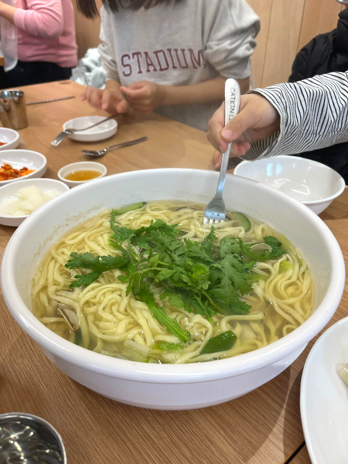 아이들을 위해 시킨 칼국수 역시 맛있었다. 2인분이라고 믿기지 않을 정도로 양이 많았다. 식당 들어오기 직전에 간식으로 십원빵을 해치운 녀석들인데도 야무지게 잘 먹었다.